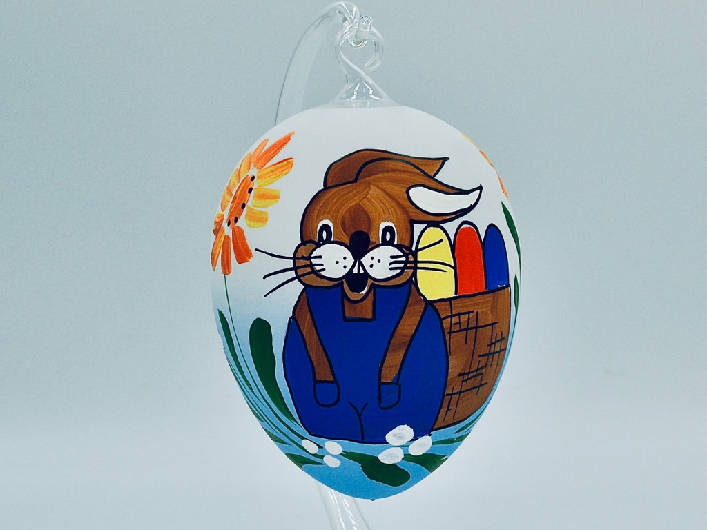 Moderní velikonoční dekorace s očkem na zavěšení např. na stojánek. Vyrobeno z foukaného technického skla SIMAX.